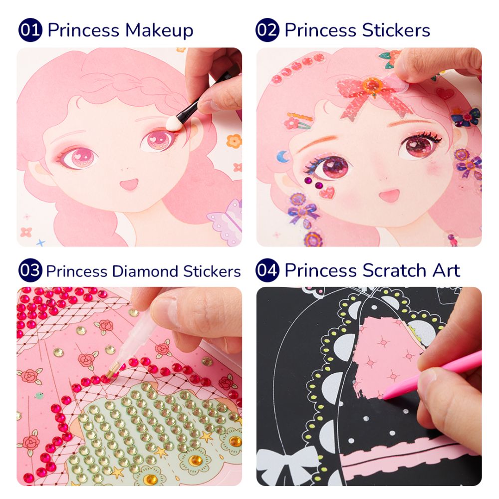 The set contains everything you need to beautify princesses - princess patterns, fashion stickers, makeup colors including a brush, rhinestones for decoration, and more.