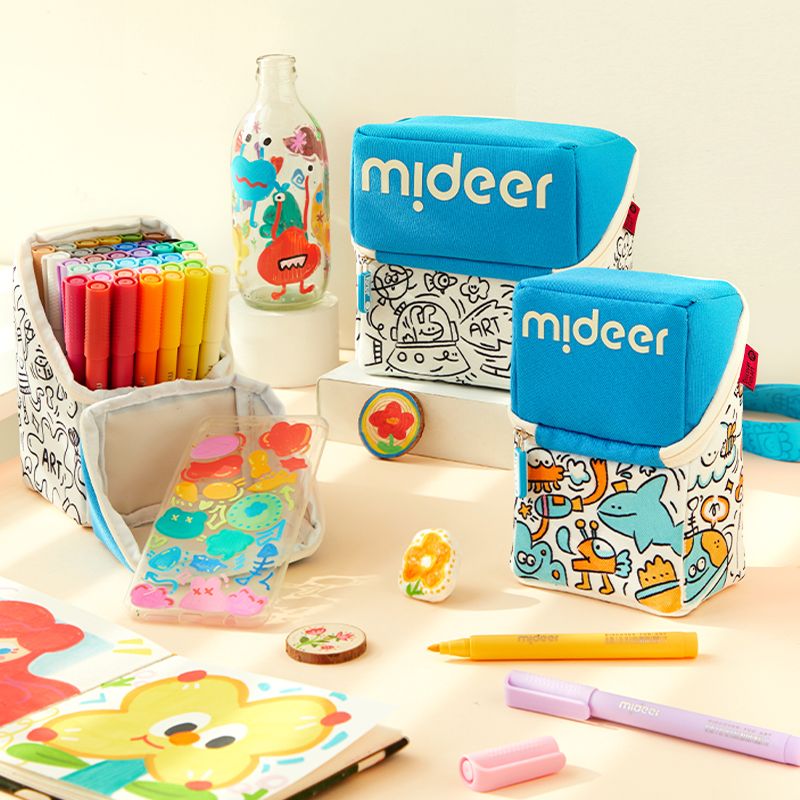 Popisovače jsou uložené v praktickém látkovém pouzdře pro snadné skladování.