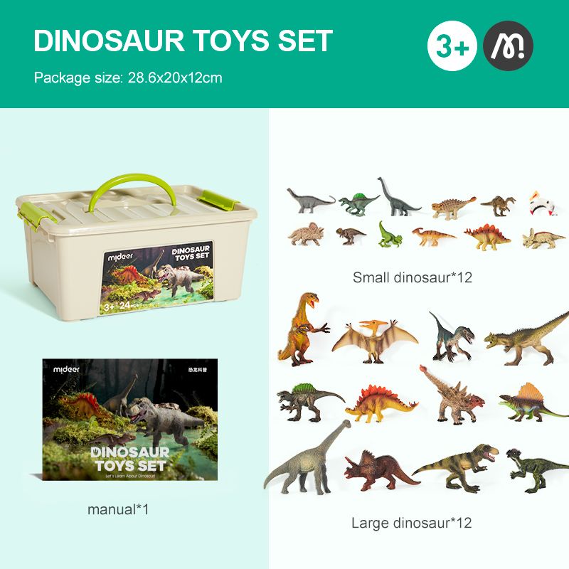 Set of 24 dinosaur figures in a plastic box for easy carrying.