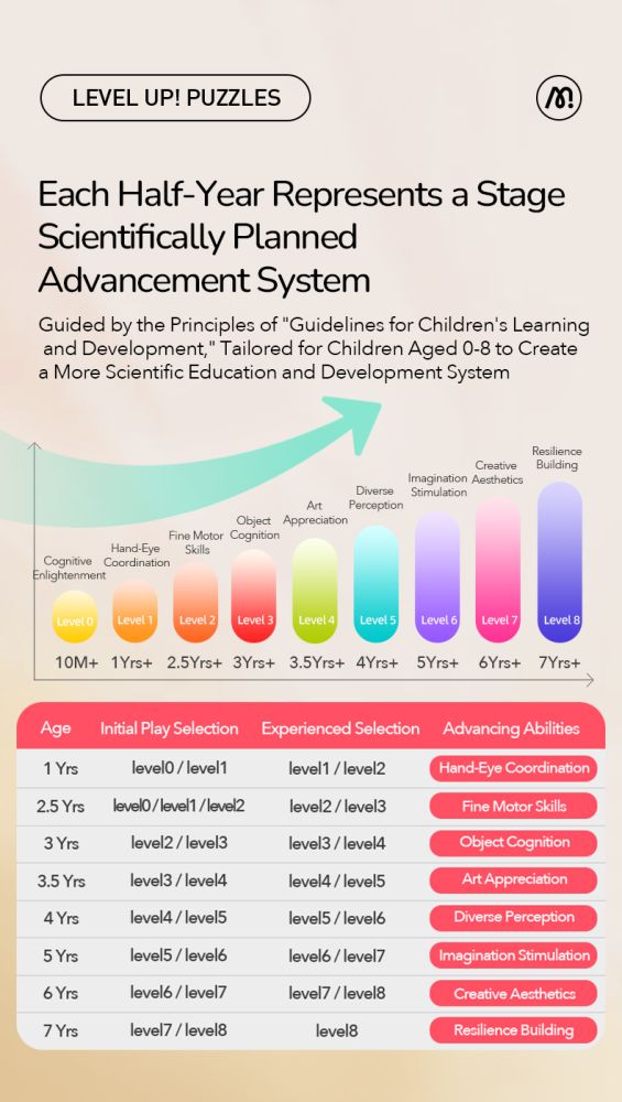 Tato sada puzzle obsahuje celkem 8 stupňů podle vývoje inteligence dětí ve věku 1-8 let, přičemž každý stupeň odpovídá dětem různého věku.