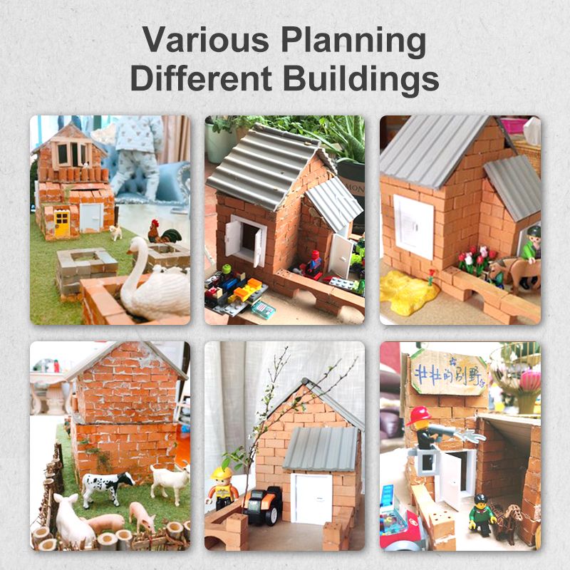 Děti pracují s materiály podobnými těm skutečným – používají mini-cihličky z pálené hlíny, okna, dveře, střešní panely a cement na bázi škrobu, který se míchá s vodou a nanáší pomocí malé lžíce.