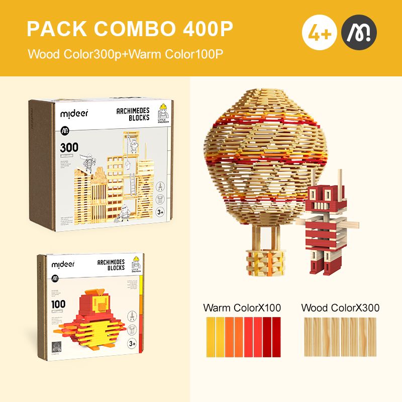 The set CONTAINS a total of 300 natural-colored wooden blocks and 100 wooden blocks in light colors for building.