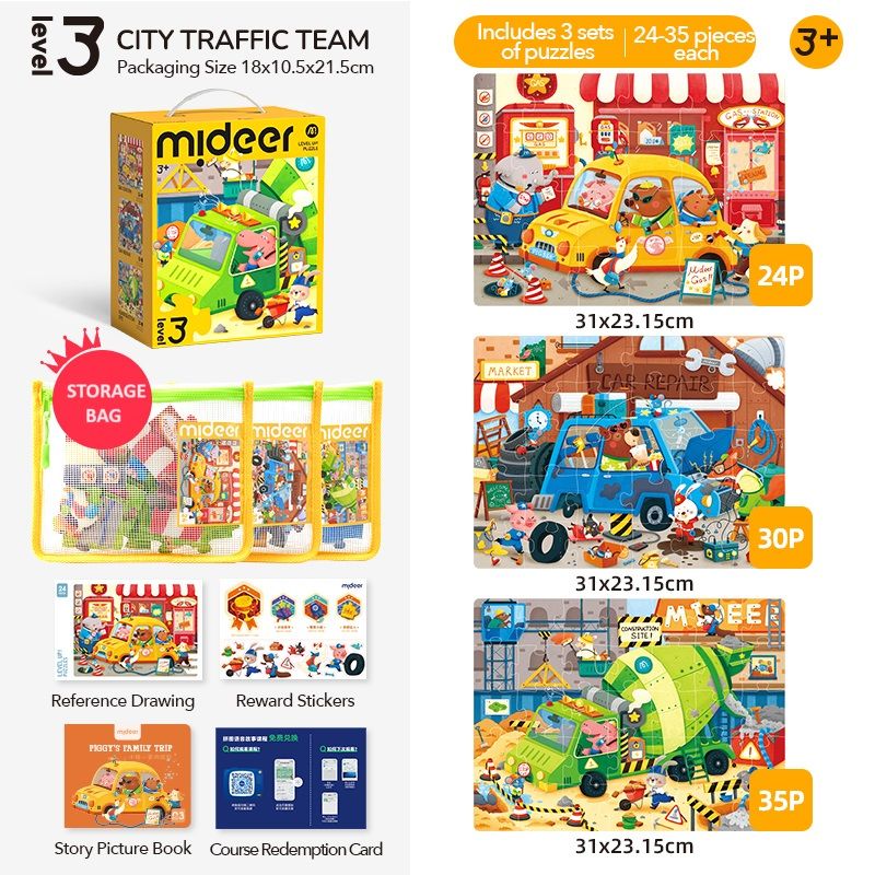 Puzzle obsahuje celkem 3 skládačky s tématikou řidičů v různých dopravních prostředcích. Skládačky obsahují 24, 30 a 35  dílků.