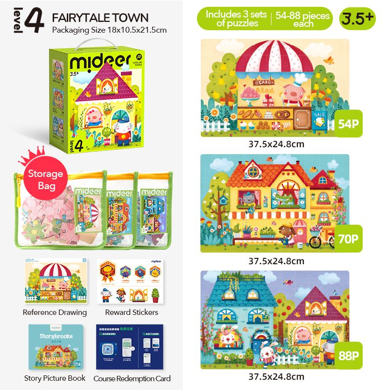 The puzzle contains a total of 3 puzzles with a fairy-tale city theme. The puzzles contain 54, 70, and 88 pieces.