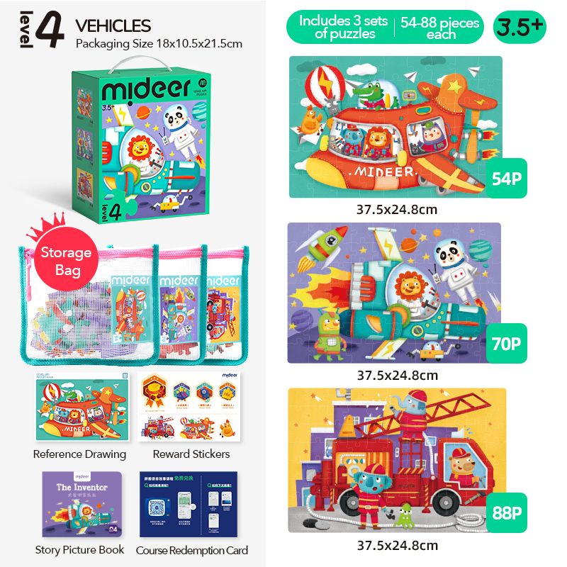 The advanced system of this puzzle is evident in three aspects. The number of pieces starts at 2 and gradually increases to 330. Furthermore, depending on the complexity of the illustration, the images change from animals to nature, cityscapes, and other scenes, and at the highest level of complexity, to world geography, thereby appropriately expanding the scope of children's learning. Finally, the artistic rendering of the illustrations also has different levels.