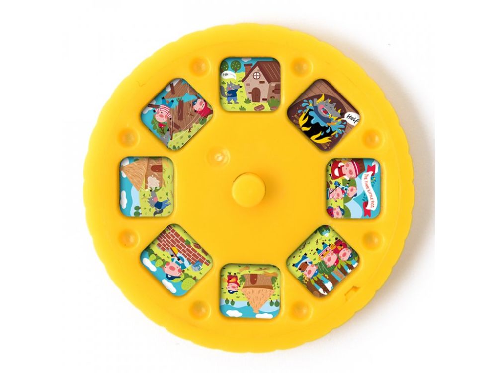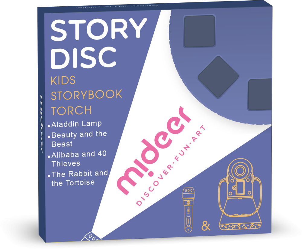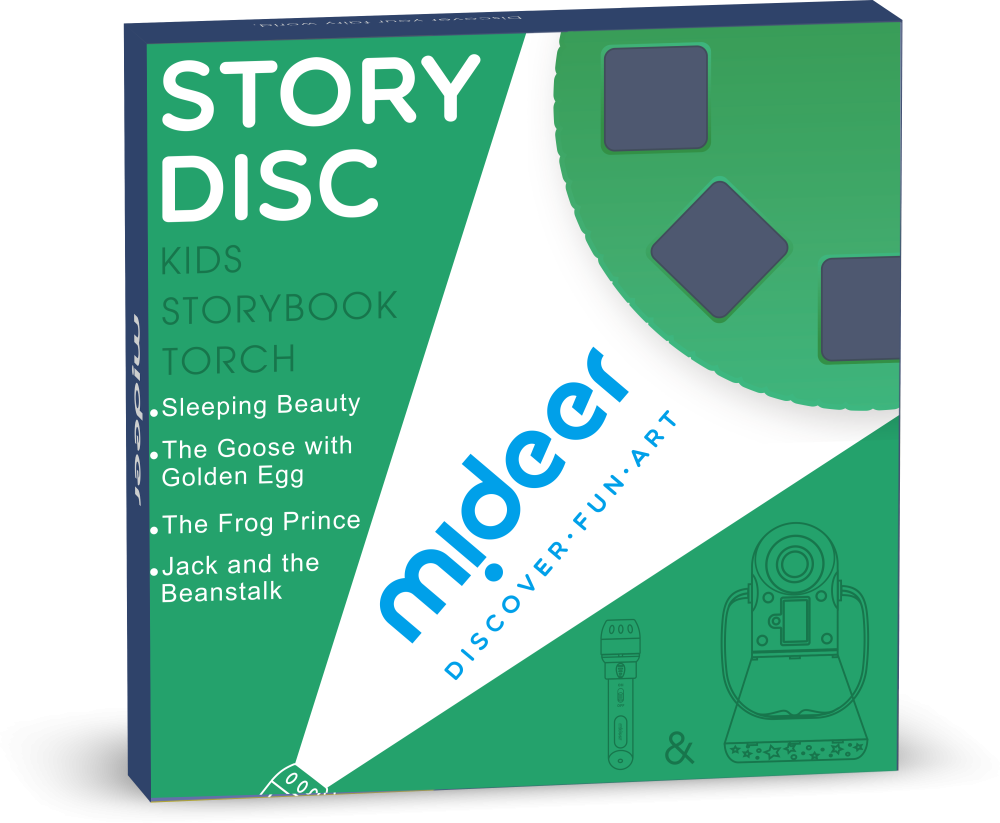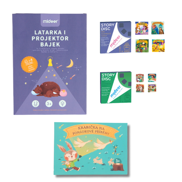Kreatywny projektor bajek dla dzieci zawierający 20 bajek Kopciuszek, Szczęśliwy książę, Żuczek, Czerwony Kapturek, Pinokio, Piernikowy ludzik, Chłopiec, który wołał wilka i Chcę polecieć w kosmos, Trzy małe świnki, Czerwony Kapturek, Brzydkie kaczątko, Lis i kot, Magiczna lampa Aladyna, Piękna i bestia, Alibaba i czterdziestu rozbójników, Zając i żółw, Śpiąca królewna, Gęś i złote jajo, Żabi książę oraz Jack i łodyga fasoli.
