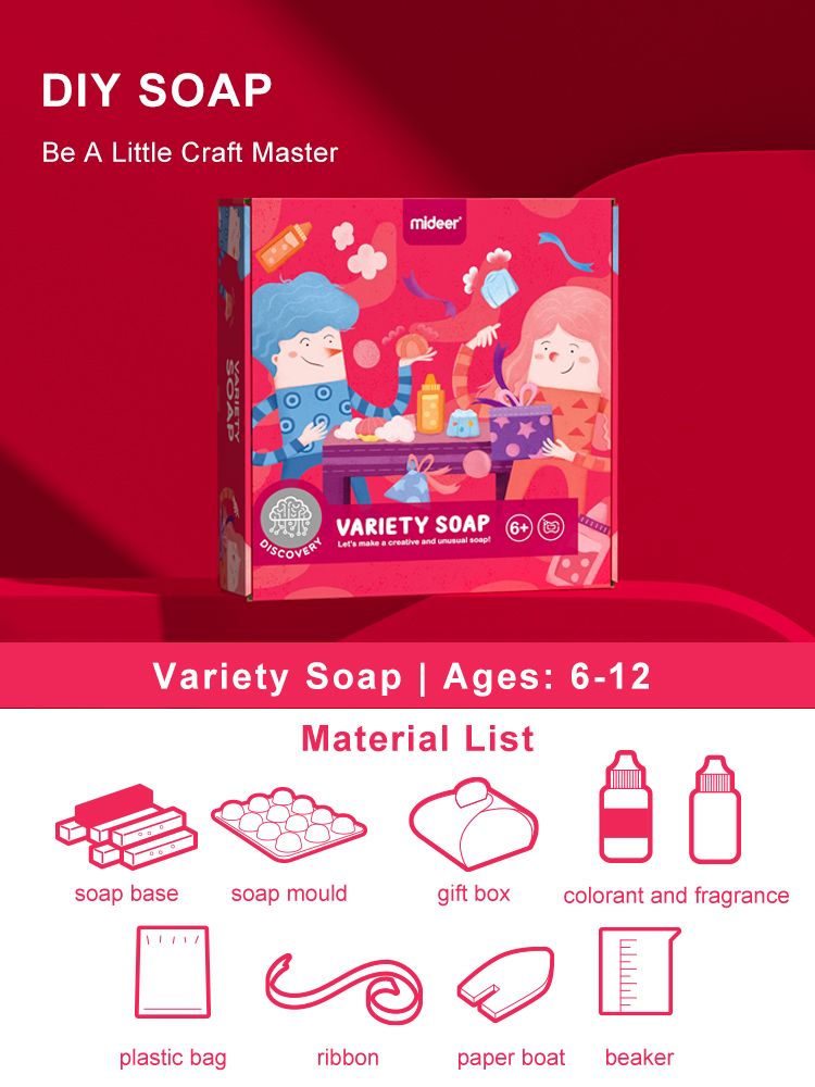 Tato kreativní sada na výrobu mýdla od Mideer je zábavný a vzdělávací set, který dětem i dospělým umožní vytvořit si vlastní barevná a originální mýdla.