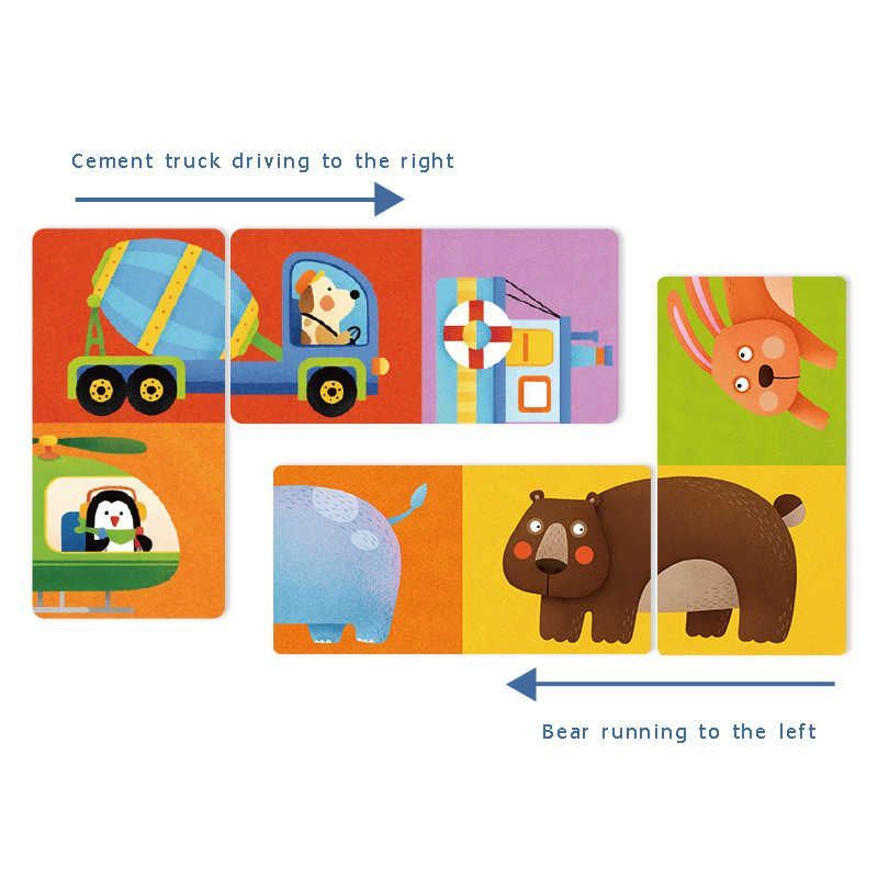 Na każdym elemencie znajdują się po dwa fragmenty zwierząt, przód i tył.